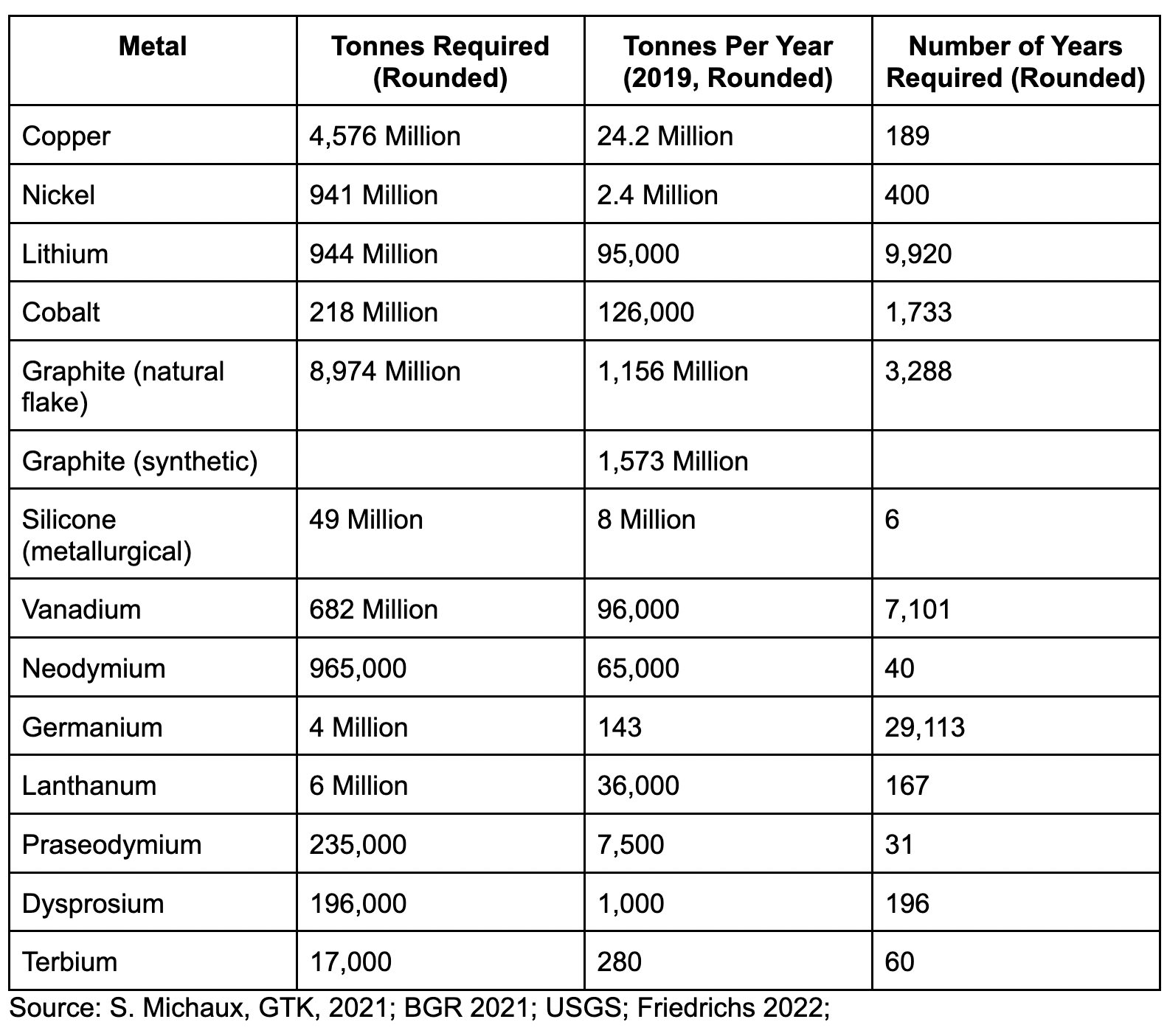 Here is a table with the quantity of each metal that is required to produce ONLY THE FIRST GENERATION of these. For proportion sake, we can compare these quantitates to how much was produced in 2019 and how many years of production these quantities represent.